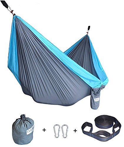 Legit Camping – Double Hammock – Lightweight Parachute Portable Hammocks for Hiking , Travel , Backpacking , Beach , Yard . Gear Includes Nylon Straps & Steel Carabiners (Blue/Grey)