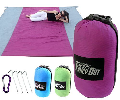 FANCYOUT Sand Free Beach Blanket, Huge Size Picnic Mat (9′ x 10′) for 7 Adults, Picnic Mat for Travel/Camping/Hiking, Nylon Beach Mat with 5 Pockets + 4 Anchor Loops & Stakes