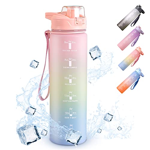 PUOENFGR Sports Water Bottle with Straw,32oz,With Both Time Marker and Water Volume Marker,Leak Proof Thickened,BPA-Free,Adults and Kids Love It,Apply To Gym,Outdoor,Travel(Blue-Pink Gradient)